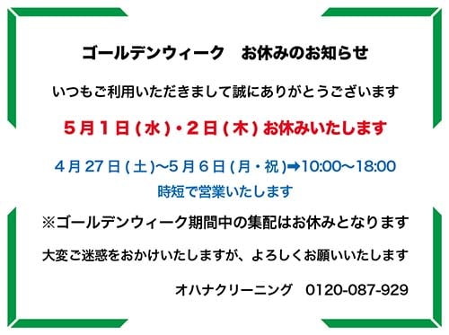 さて、オハナクリーニングのゴールデンウィークは